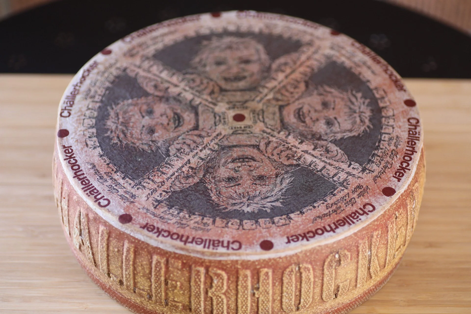 Cheese: Challerhocker is a semi-hard cow's milk cheese aged in caves for 10-12 months, developing a rustic brown rind. The paste is dense and creamy, with a complex flavor profile featuring notes of roasted peanuts, brown butter, and caramel, and a slightly granular texture.