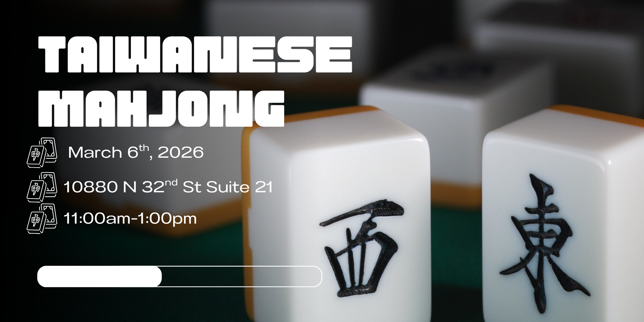 We'll start with a 30-minute intro at 11:00 AM to walk through the basics of Taiwanese mahjong. Then it's time to play, shuffle, and see what the tiles bring. Whether you're here to learn or ready to build your hand, grab a seat at the table. Taiwanese mahjong is played using 16 tiles and is different from other forms of mahjong (such as American mahjong). It does not use cards and is fun to learn!